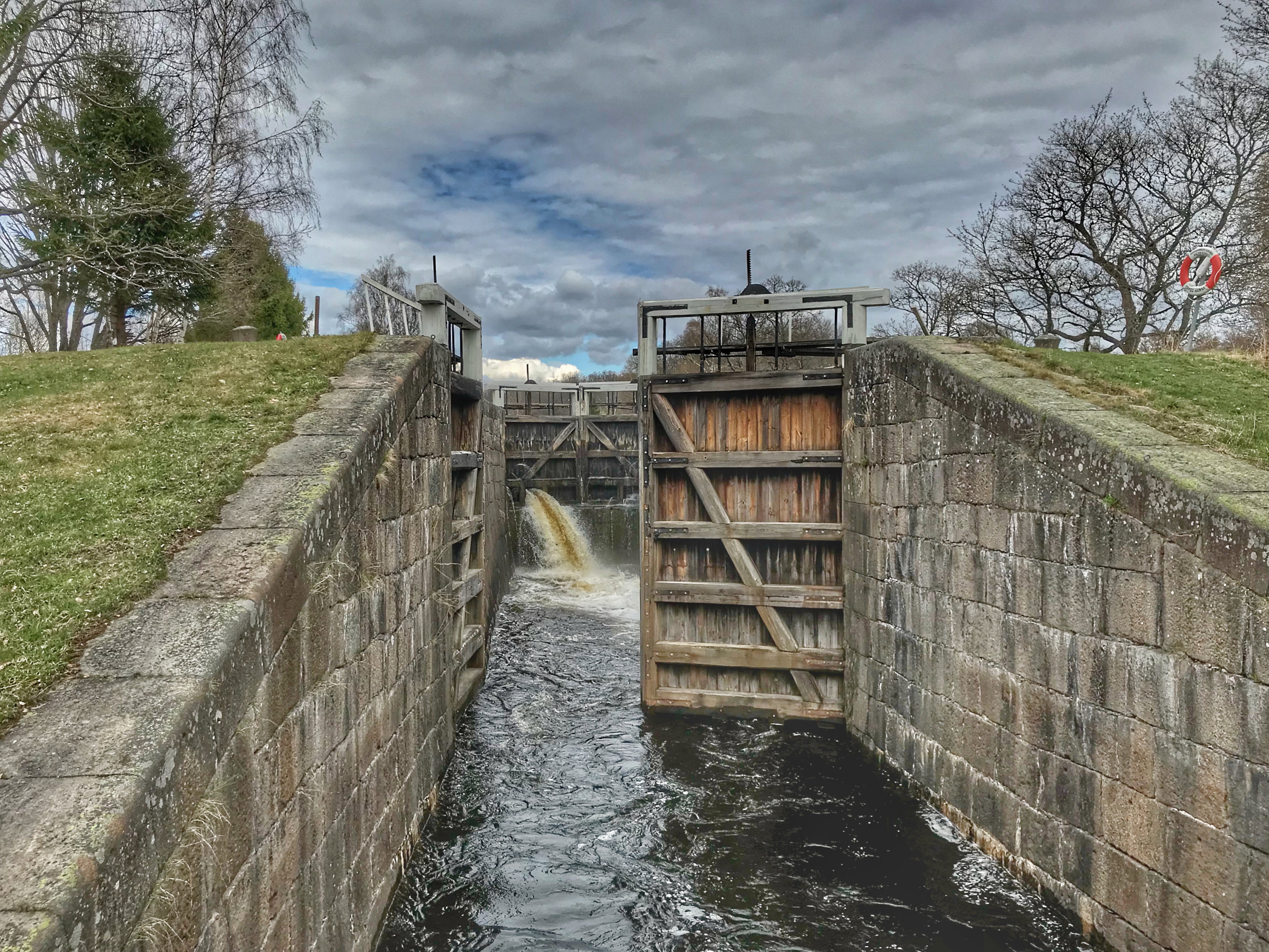 Vid Hofgårds sluss öppnar sig en fantastisk vy mot Sura kyrka. Här finns flera informationsskyltar som berättar om slussens betydelse för sjöfarten och om den vackra kyrkan.